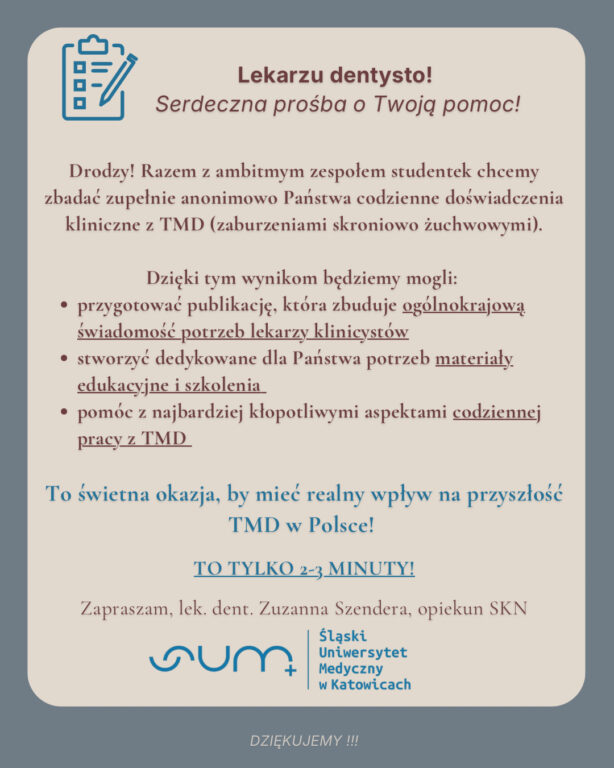 Pani dr stomatolog jest pracownikiem Śląskiego Uniwersytetu Medycznego i prowadzi badanie ankietowe mające na celu przekrojową ocenę wiedzy lekarzy dentystów na temat zaburzeń skroniowo żuchwowych.